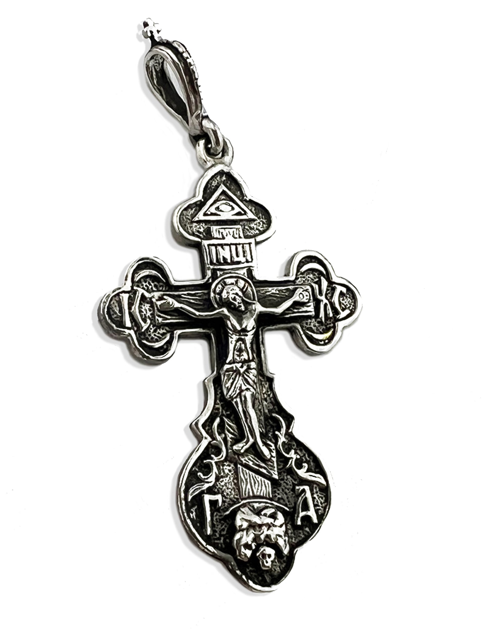 This exquisite sterling silver crucifix pendant combines spiritual devotion with refined craftsmanship. Measuring 1 3/4 inches including the bail, the cross features a detailed crucifixion scene paired with the revered Icon of the Virgin of Kazan. The reverse bears "Save Us" inscribed in Slavonic script, adding profound spiritual significance. Crafted from hallmarked 925 sterling silver, this heirloom-quality piece showcases meticulous detail and lasting durability. Presented in an elegant tapestry cloth pouch, it makes a meaningful gift for those seeking to express their Orthodox faith with elegance and authenticity.
