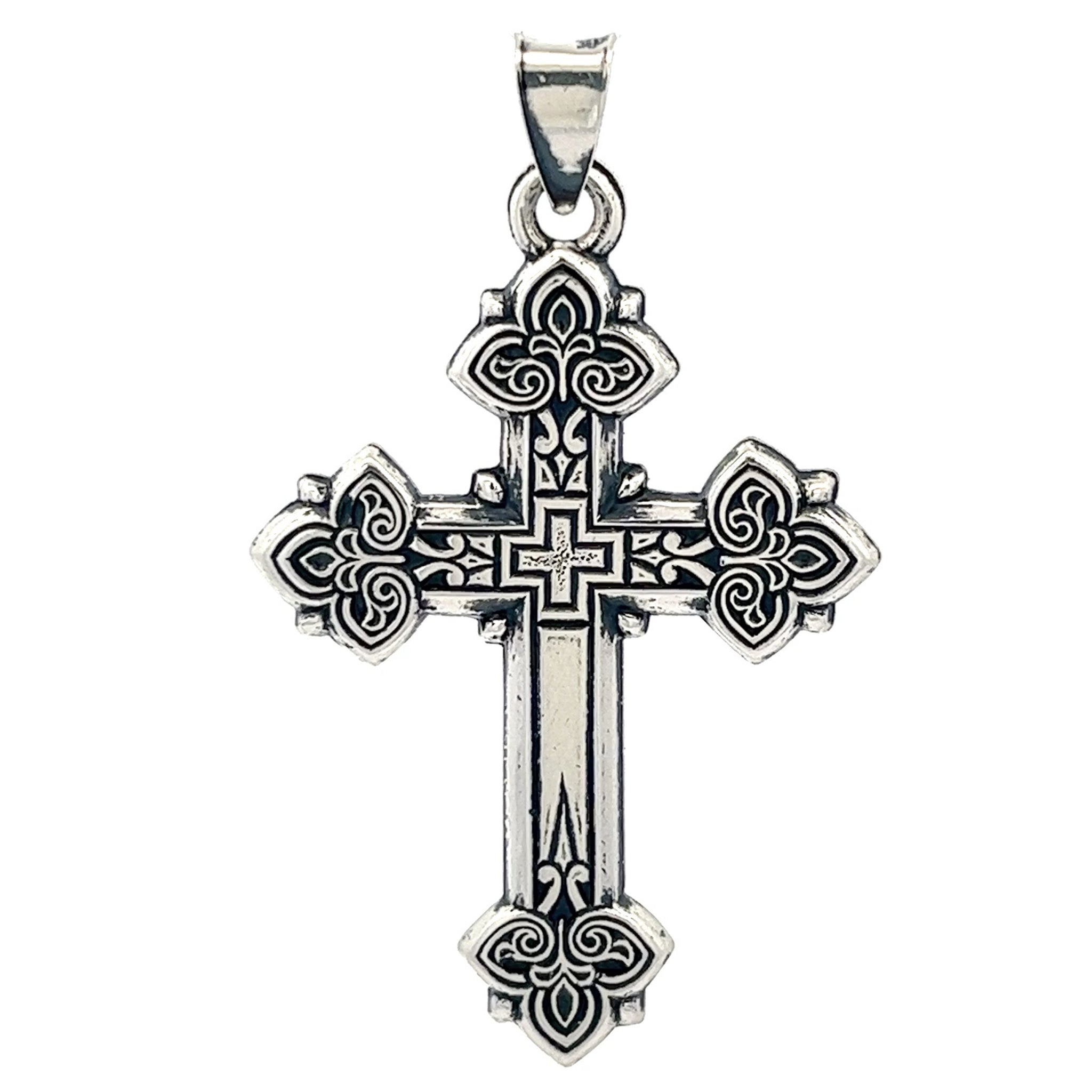 This elegant sterling silver cross pendant exemplifies timeless religious craftsmanship. Meticulously stamped from authentic 925 sterling silver, the piece measures 1 3/8" in height by 3/4" in width, with an included bail extending to 1 1/2". Suitable for both Catholic and Orthodox Christian traditions, it serves as a meaningful devotional accessory or cherished gift. The pendant arrives beautifully presented in a protective tapestry pouch, ready for immediate wear or gifting. A refined choice for those seeking authentic spiritual jewelry with enduring quality and understated sophistication.