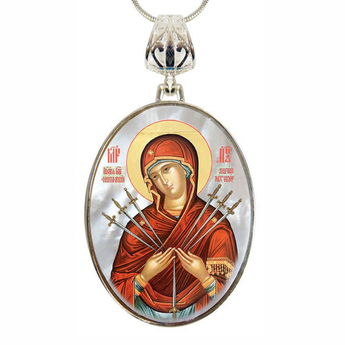 Virgin Mary of The Seven Swords Silver Plated Mother of Pearl Necklace