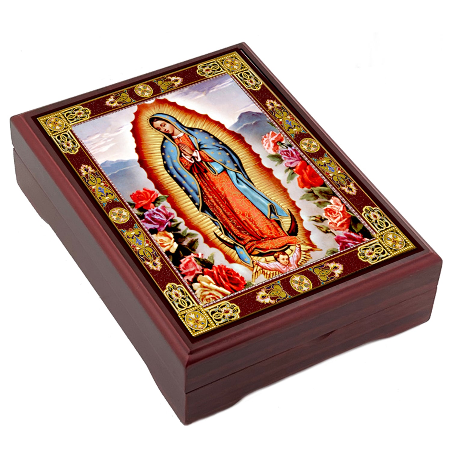 This elegant wooden icon box honors Our Lady of Guadalupe with timeless devotional appeal. Measuring 5 1/16" long by 4 1/16" wide and 1 1/2" high, it features a luxurious red velvet lining perfect for safeguarding rosaries, prayer beads, religious medals, and delicate jewelry. The sturdy wooden construction and refined craftsmanship make it an ideal keepsake for personal spiritual practice or a meaningful religious gift. A reverent way to preserve treasured sacred items.