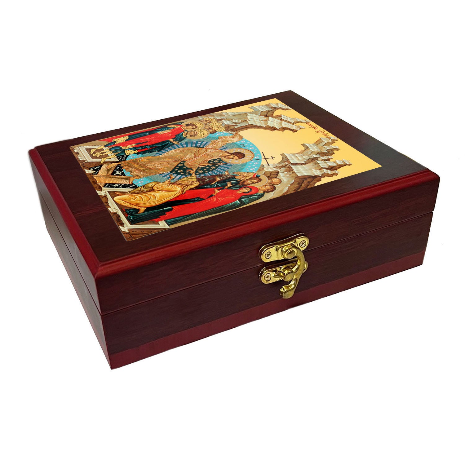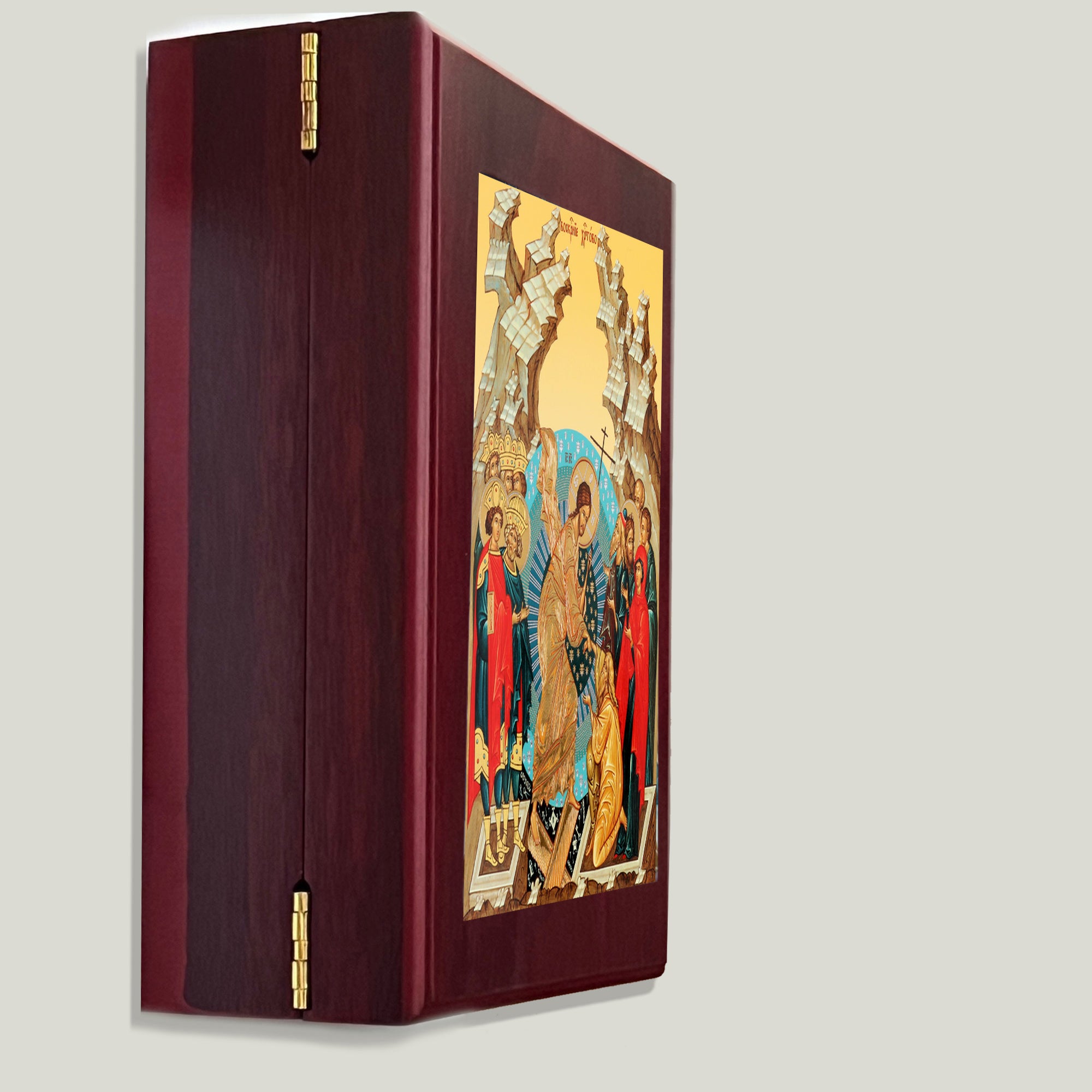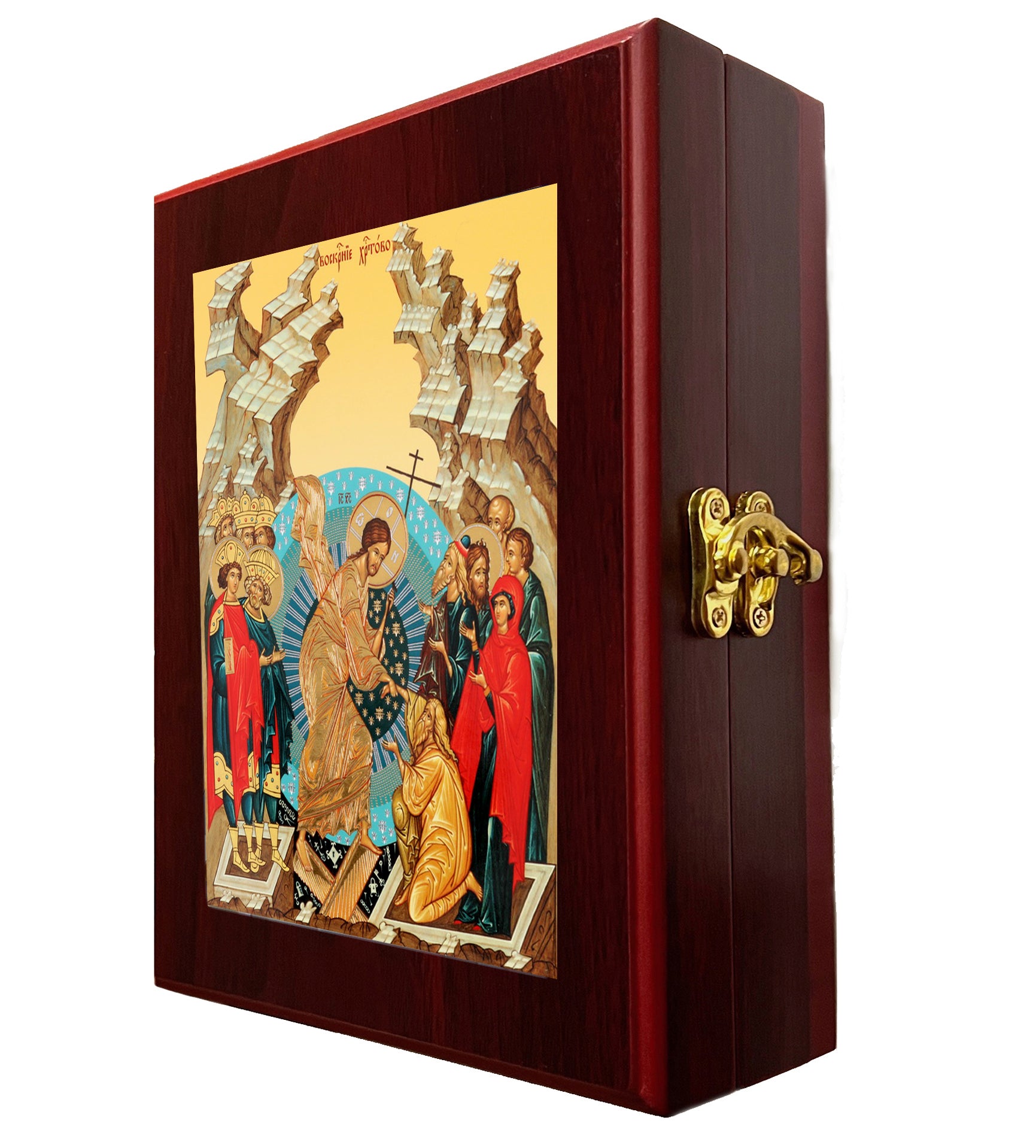 This elegant Resurrection Icon box merges spiritual devotion with practical storage. Crafted from quality wood and lined with luxurious faux red velvet, it serves as both a wall-mounted display piece and a tabletop keepsake. Perfect for safeguarding prayer ropes, sacred beads, jewelry, prayer cards, and cherished religious items. The secure side lock ensures your treasures remain protected. Standing 7½ inches tall, this sophisticated piece brings reverent beauty to any space while honoring your faith.