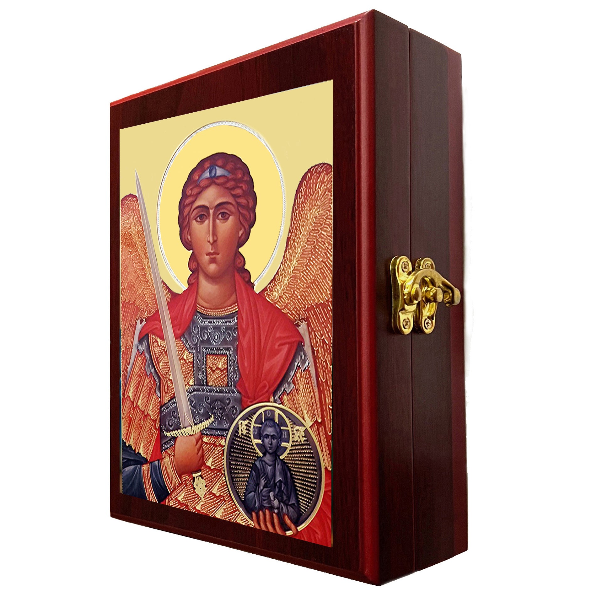 Elevate your spiritual practice with this sophisticated Saint Michael framed wooden icon box, a versatile keepsake designed for both wall display and tabletop presentation. Crafted from quality wood and lined with luxurious faux red velvet, this 7½-inch sanctuary securely stores rosaries, prayer beads, jewelry, prayer cards, and sacred mementos. The side-locking mechanism ensures your treasured devotional items remain protected while maintaining refined elegance. Whether displayed prominently on your wall or positioned on a cherished shelf, this thoughtfully designed piece creates a dedicated sanctuary for your spiritual collection, blending timeless craftsmanship with purposeful beauty.