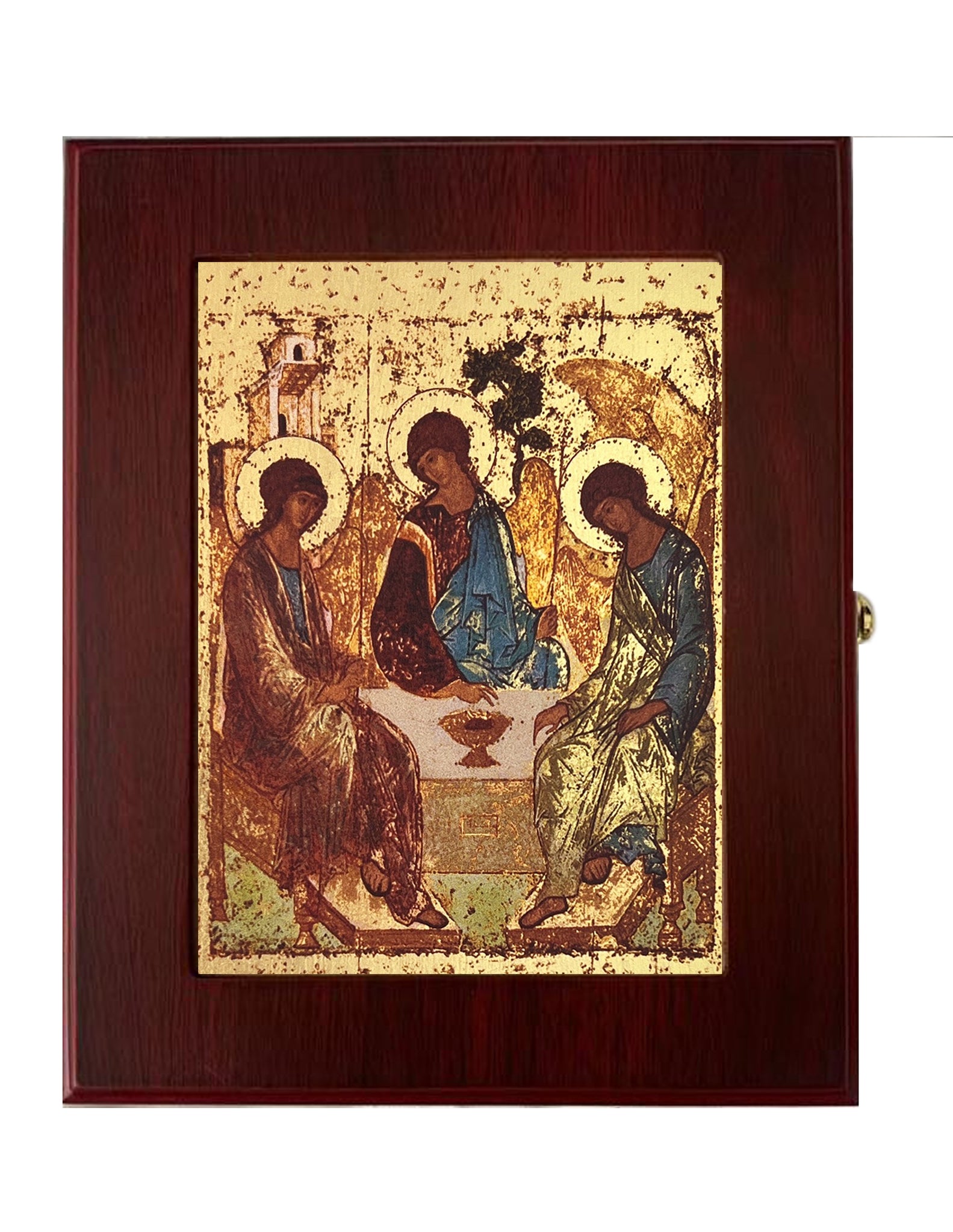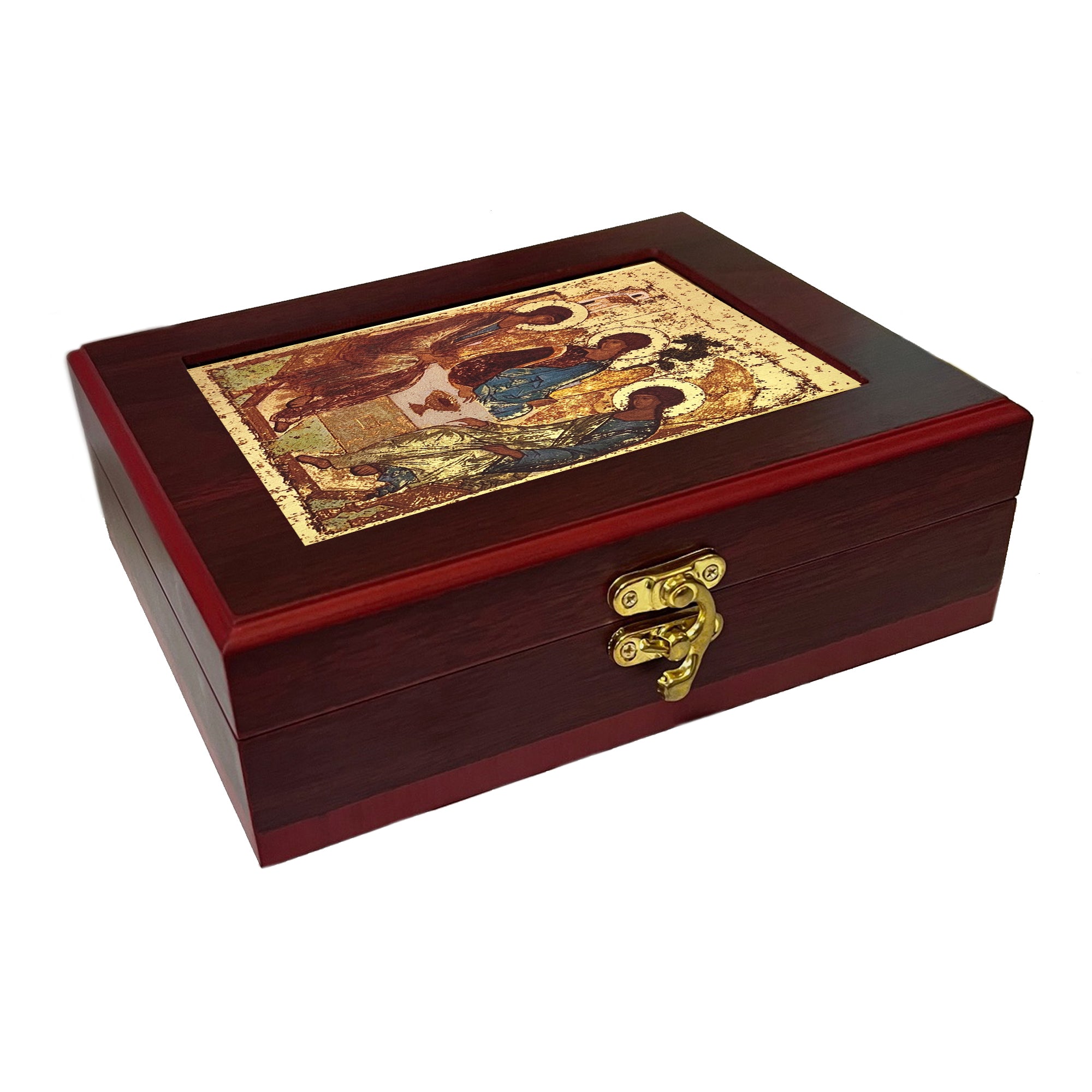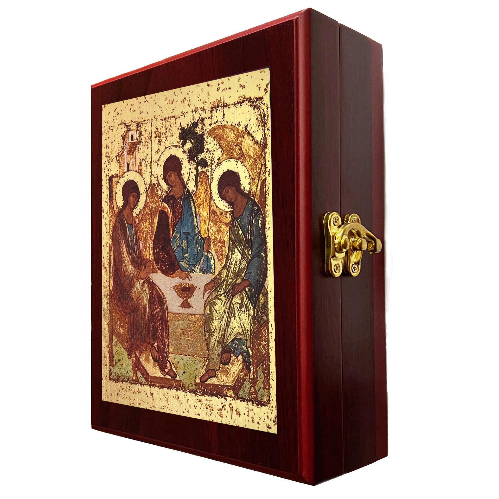 Elevate your sacred space with this exquisite Byzantine Greek Icon box, a sophisticated fusion of spiritual artistry and functional elegance. Hand-crafted from quality wood and adorned with gold gilding, this 7½-inch wall hanging box features a stunning silkscreen Orthodox Holy Trinity icon on cotton canvas. The interior reveals sumptuous faux red velvet lining, providing a dignified sanctuary for treasured keepsakes—prayer ropes, jewelry, devotional cards, or cherished mementos. A secure side lock ensures your sacred items remain protected. Display as a framed wall accent or position on your table as a reverent keepsake box. A meaningful addition to any home altar or spiritual collection.