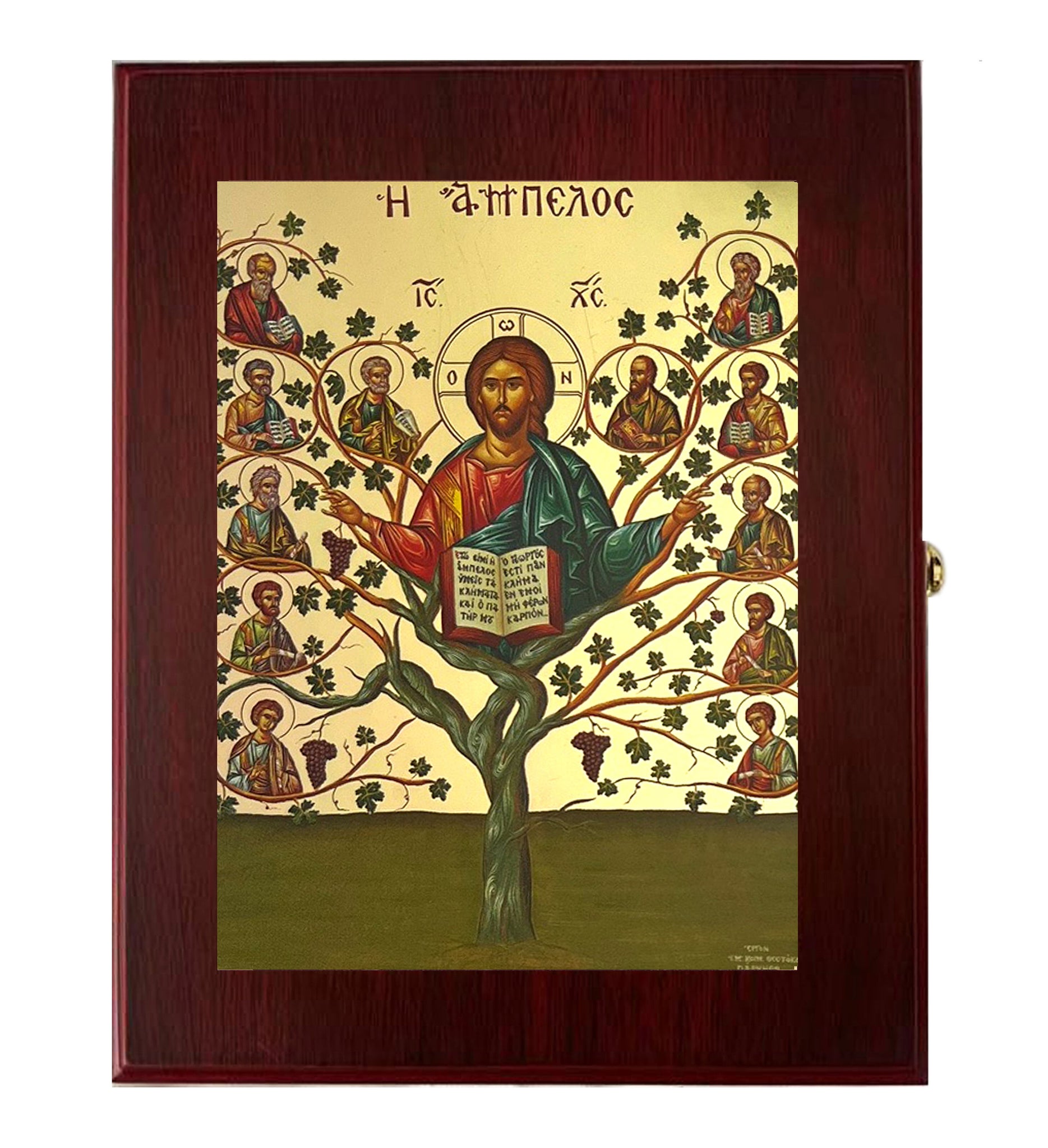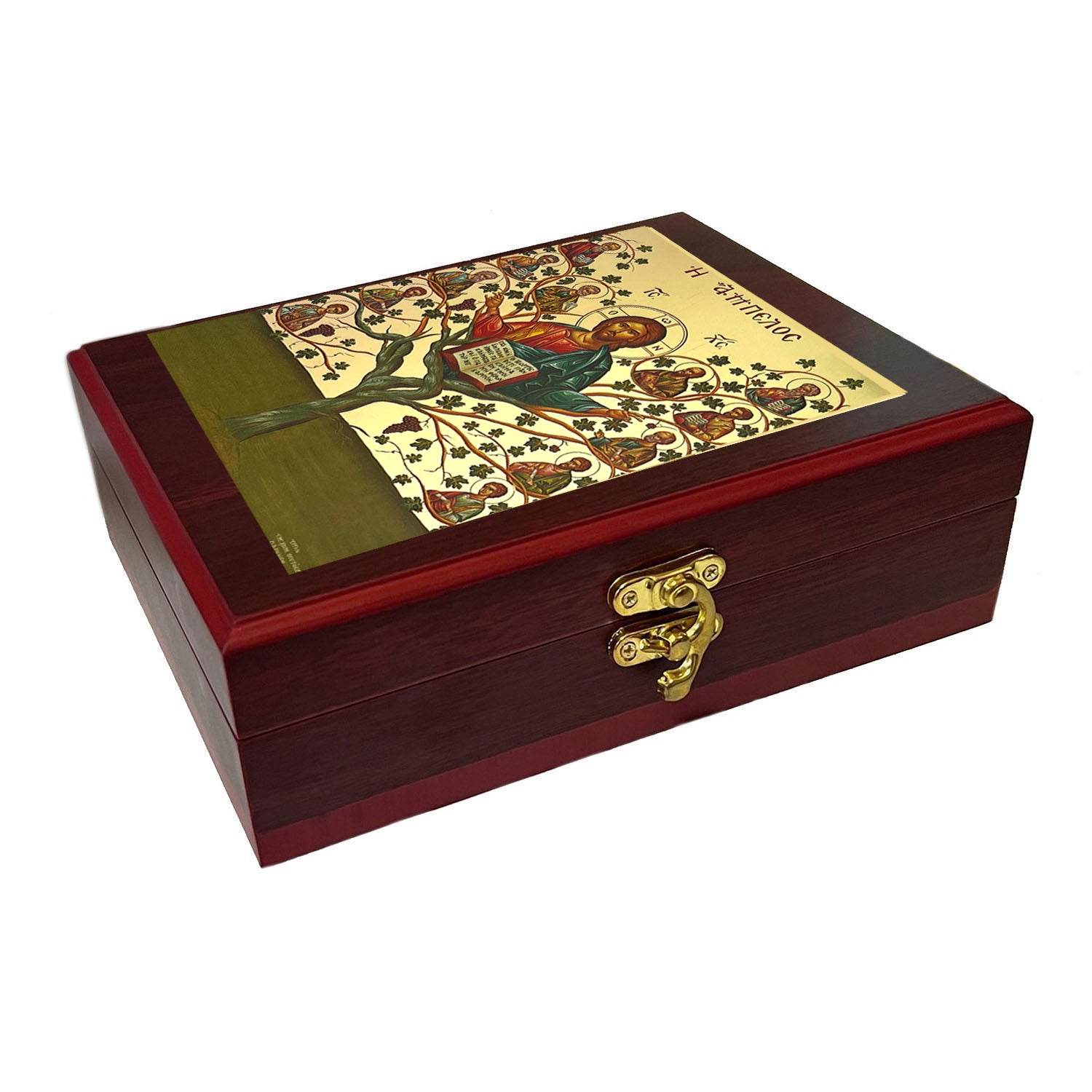 This elegant Orthodox icon box merges spiritual devotion with functional beauty. Featuring the revered Christ, The Vine-tree Byzantine icon, it serves as both a wall-mounted display piece and a practical keepsake container. The wooden construction is lined with sumptuous faux red velvet and secures with a side lock, making it ideal for storing prayer ropes, beads, jewelry, prayer cards, and other sacred treasures. At 7½ inches tall, this sophisticated piece honors the profound symbolism of the Theotokos and Christ's divine nature—a meaningful gift for those seeking to deepen their spiritual practice or commemorate important occasions.