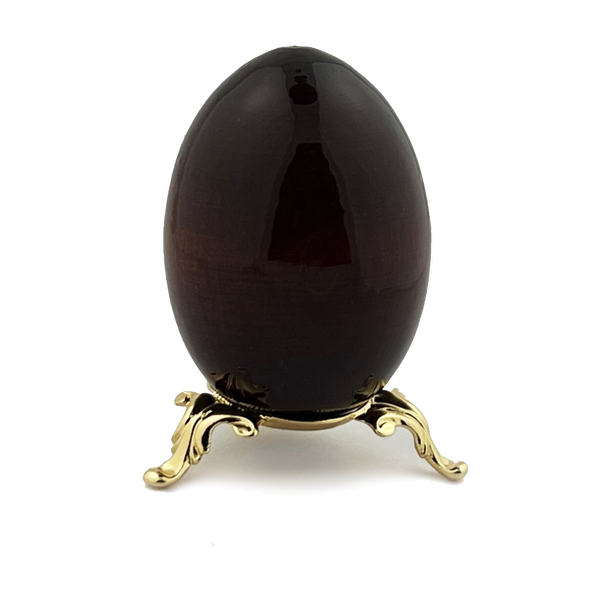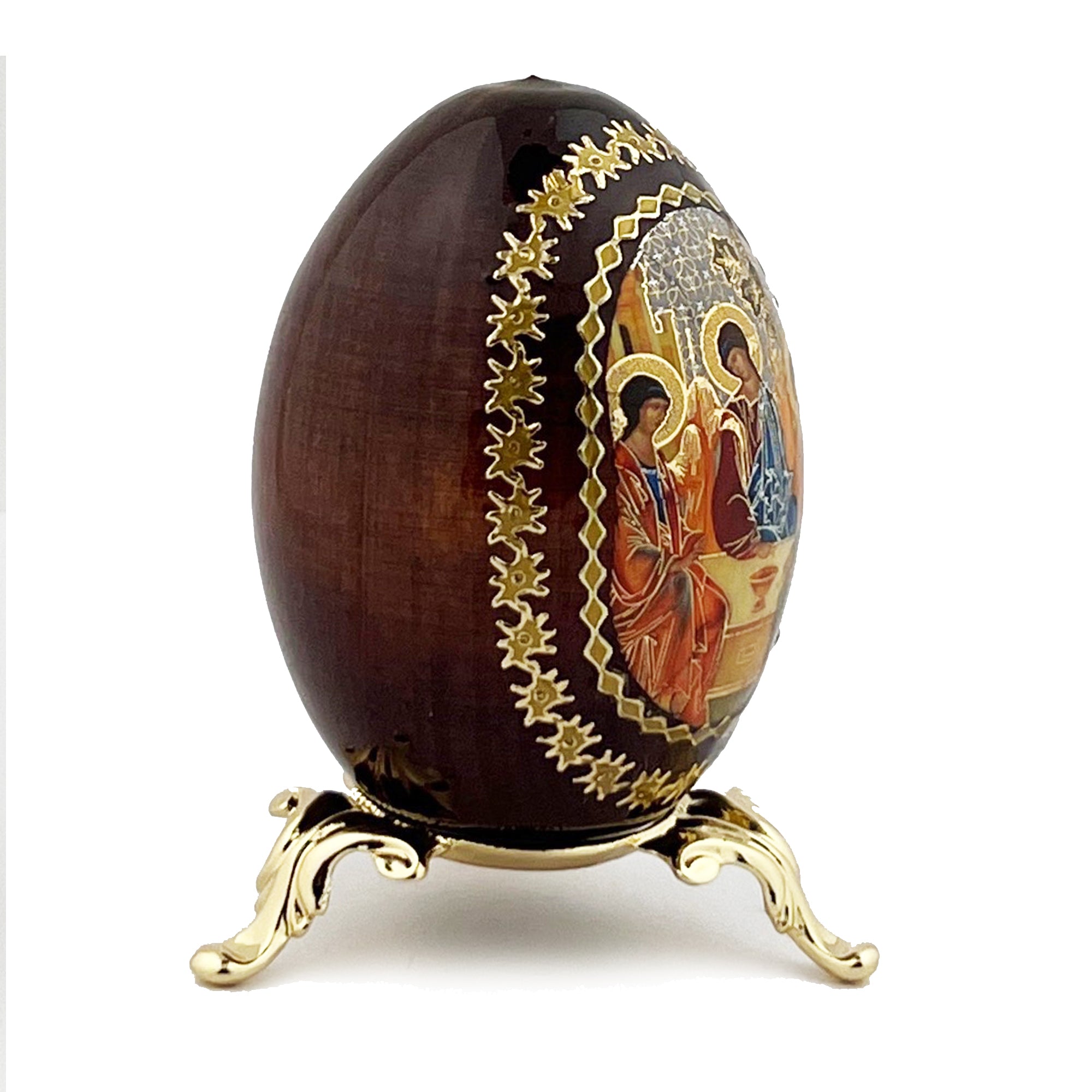 Holy Trinity Icon Egg Wooden on Gold Metal Stand - Holy Trinity Icon is Gold Foil